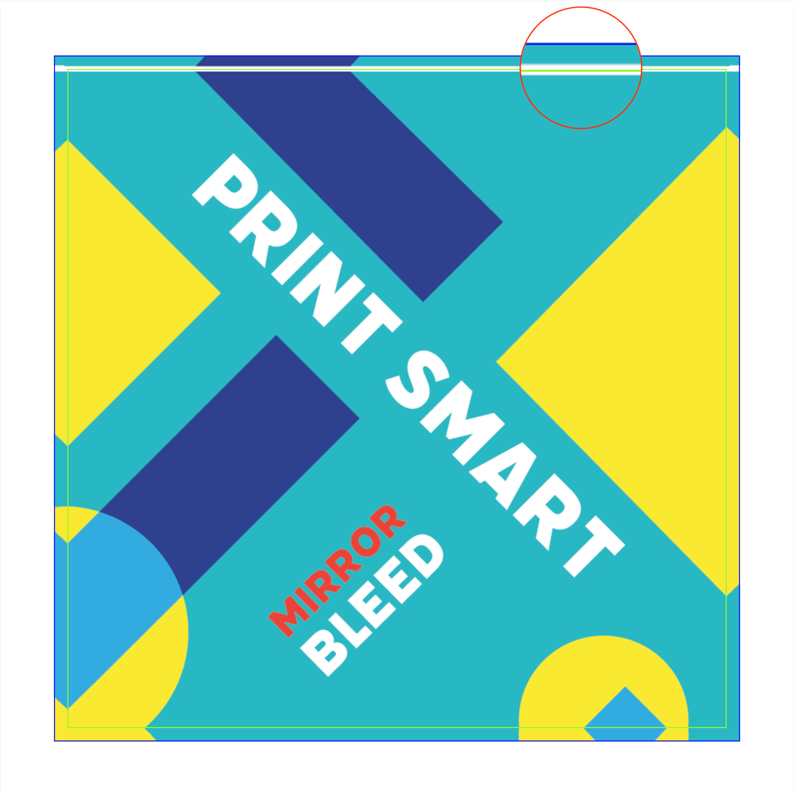 A mirror bleed duplicates the outer 3mm of your artwork and reflects it into the bleed area, creating an inverted image around each edge. This bleed will prevent unprinted edges from showing the paper's natural colour after trimming. While white keylines and parts of the bleed section may still be visible around the outer edges, it is an effective way to safeguard content.