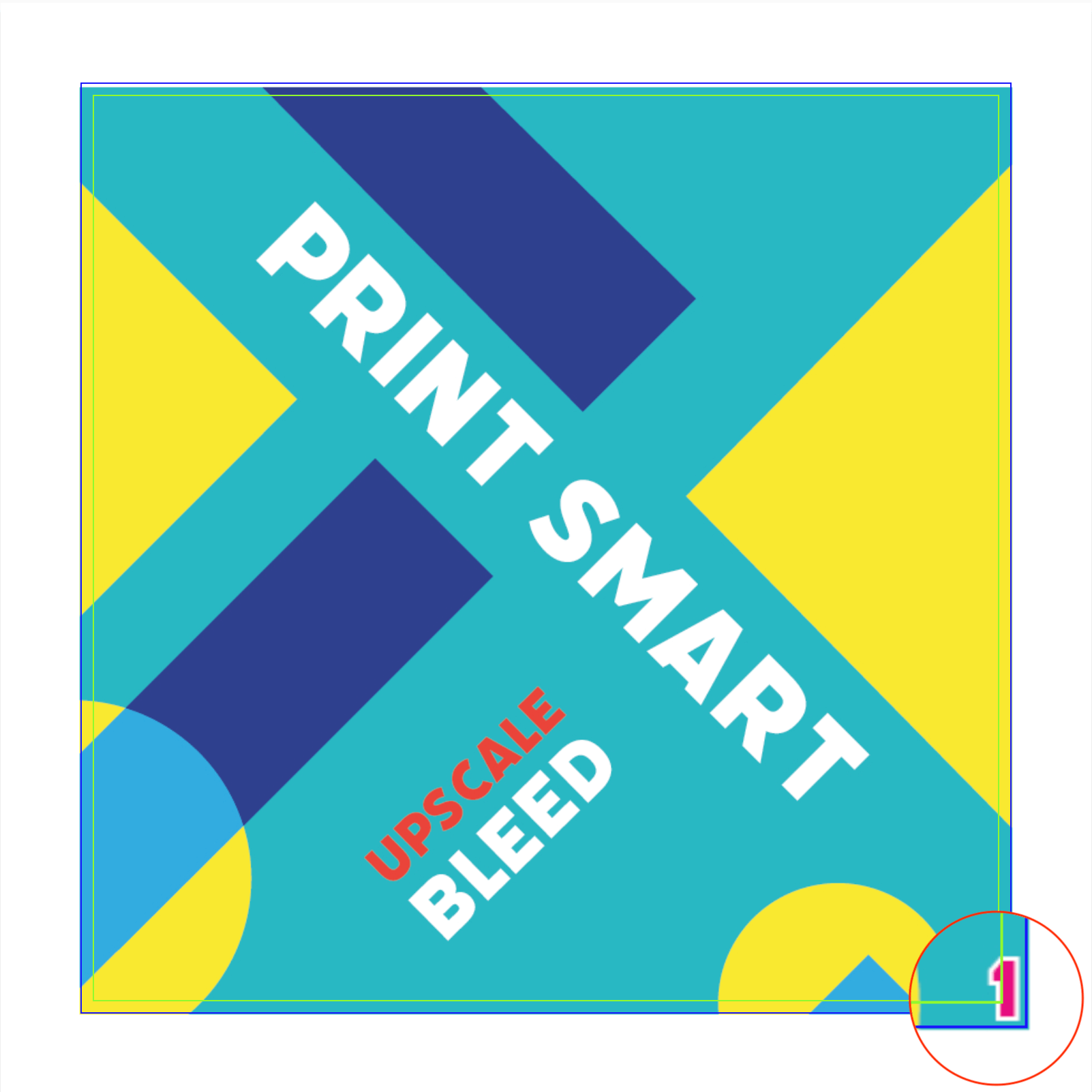 An upscale bleed will extend your artwork from the trim to the bleed size. This bleed ensures a natural continuation of your design, and your artwork is positioned 0.125" inside the bleed area and away from the page edge. This bleed reduces the possibility of keylines appearing and is suitable for content far from the trim edge.