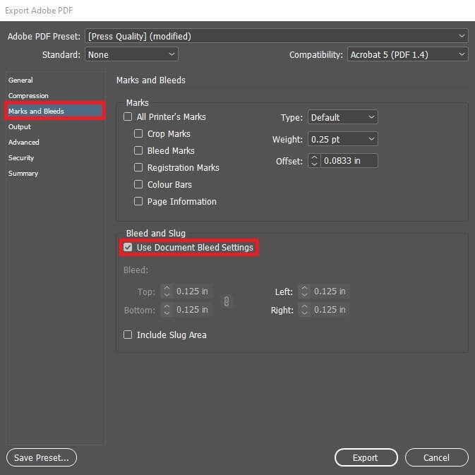 TIP: If you use a program like InDesign, select Use Document Bleeds in the Export PDF dialogue box to ensure your files include a bleed (see above).