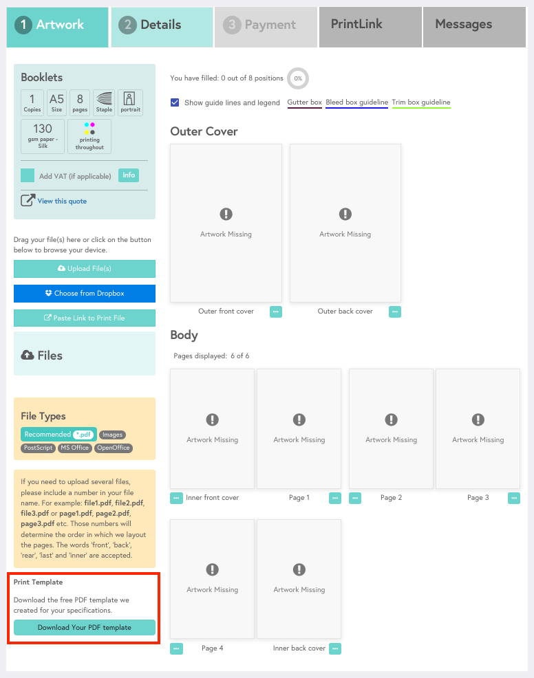 Ensure you have the correct measurements and bleed on your files before uploading them. Naming your files will ensure they appear in the intended order and are easy to locate if you need to edit them. You can use names like frontcover.pdf, backcover.pdf, page1.pdf, page2.pdf, etc.