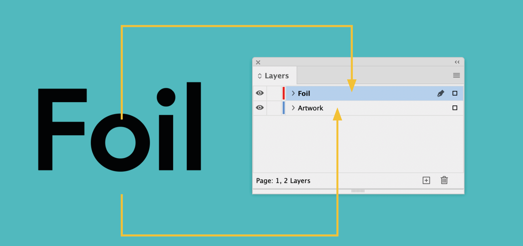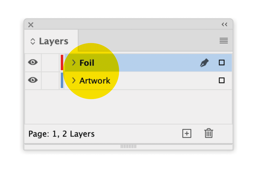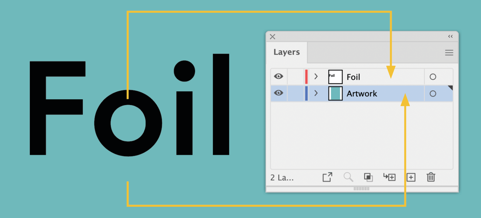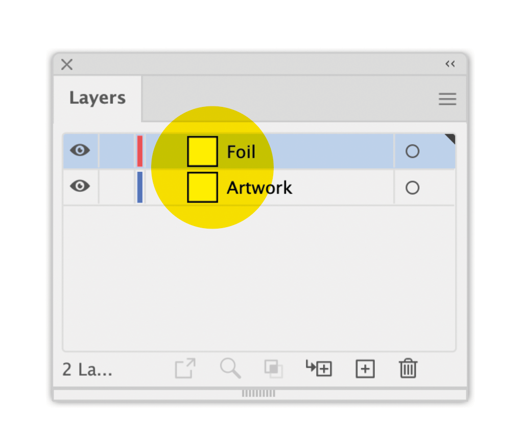 1. When you're ready to prepare your files for print, ensure both your artwork layer and your foil layer are visible. To do this, go to your Layers palette and make sure you have checked the eye icon so it's 'on' to the left of each layer name.