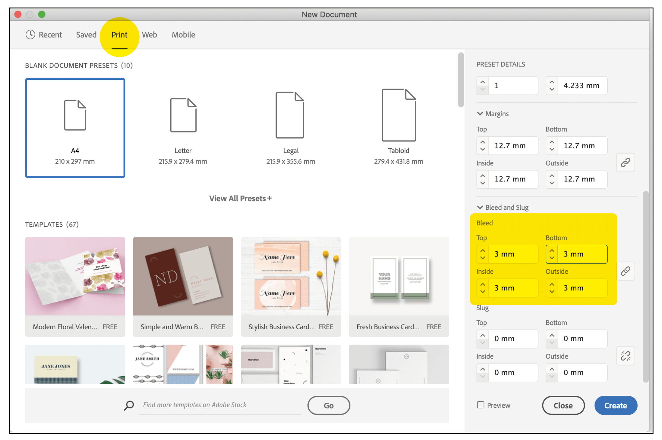 1. Select the Print tab when you create your new document. By default, InDesign will produce a document using a CMYK colour palette, not RGB. Learn more about the difference between CMYK and RGB here.