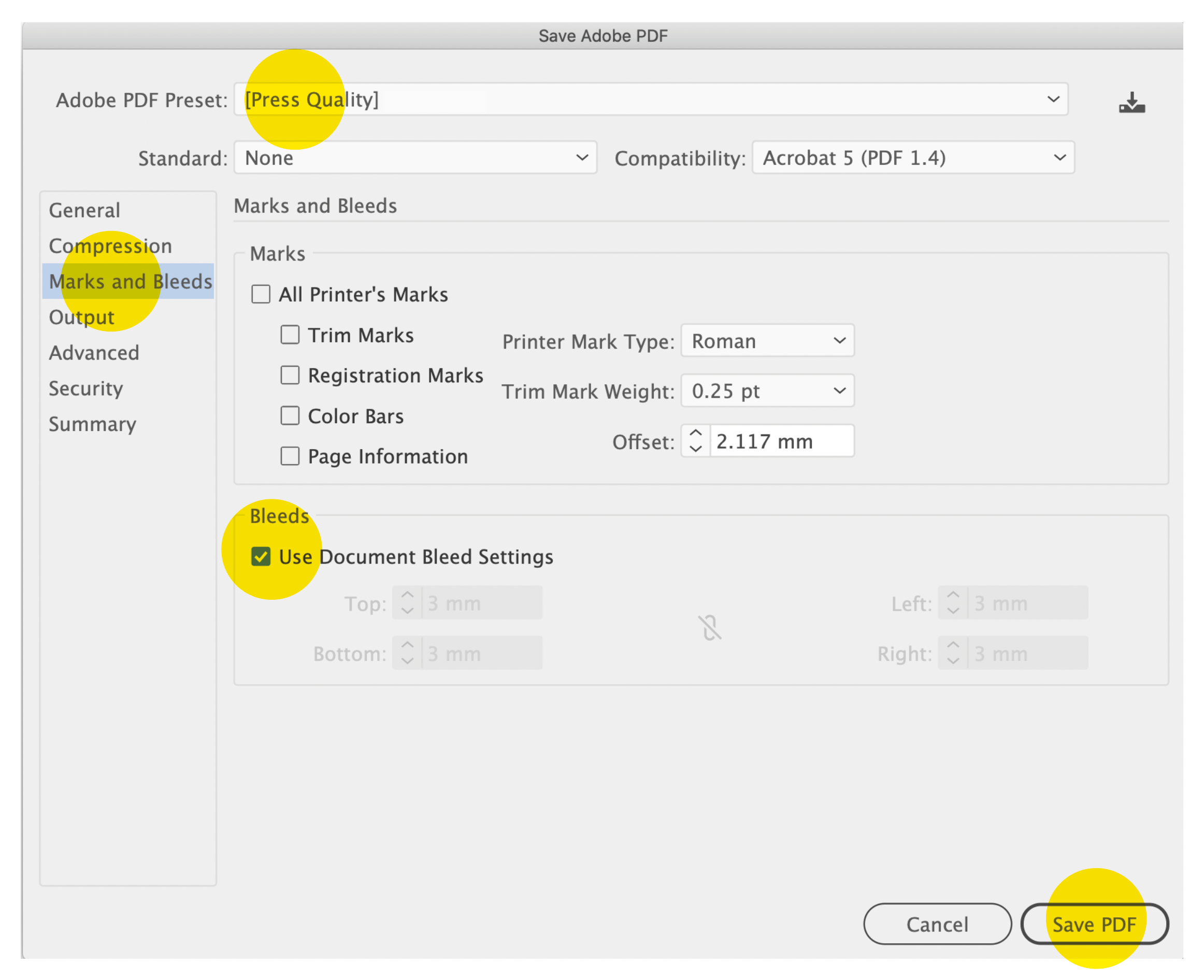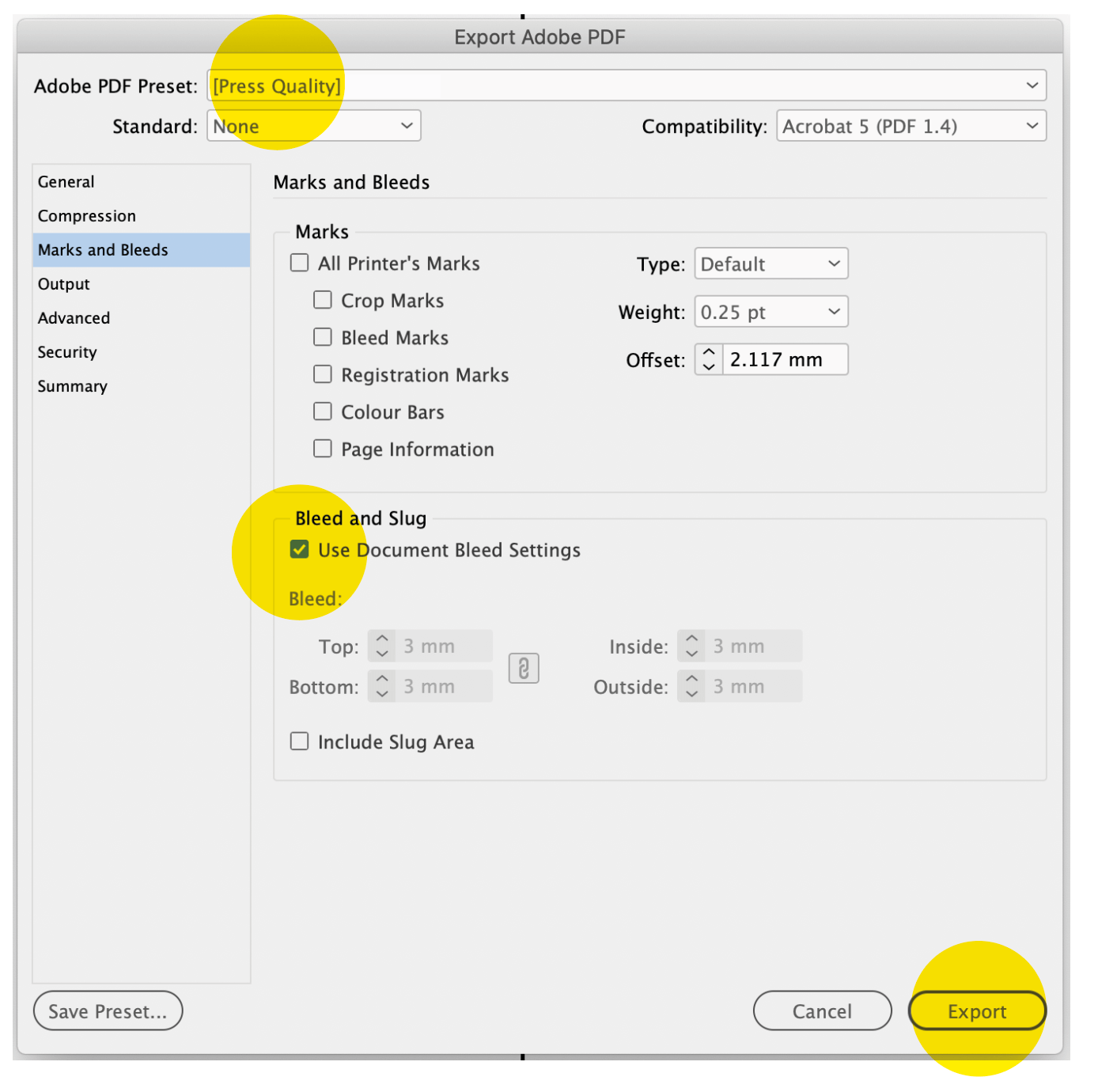 3. This will open up your Export Adobe PDF window. From the drop-down menu at the top titled Adobe PDF Preset, select Press Quality. Next, on the left of the window, select the menu titled Marks and Bleeds, and under Bleed and Slug, check the box titled Use Document Bleed Settings. These settings should be 3mm as Mixam requires a 3mm bleed on all print files. If you haven't set 3mm bleed on your document, you must do this, then repeat the Export steps. Unlike other printers, our system adds its own crop marks. Under 'Marks and Bleeds', please don't check the box for crop marks.