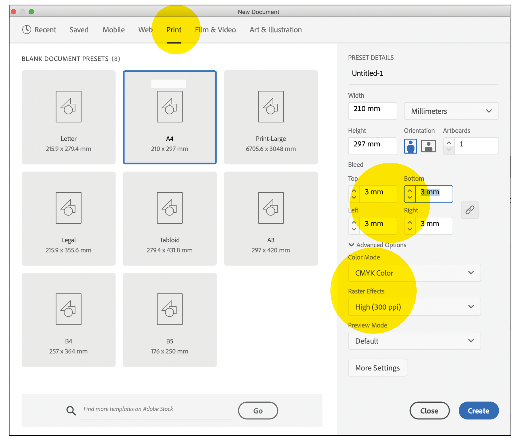 1. When you open your new document, ensure it is in CMYK colour mode, not RGB. Learn more about the difference between CMYK and RGB here.