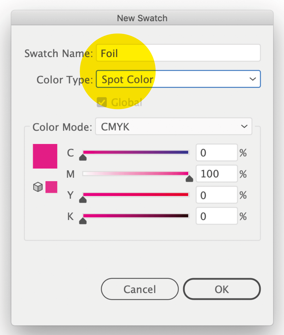 2. In the Swatches palette, click on the small 'hamburger' menu icon top right, select New Swatch > Type Foil into the Swatch Name field > Go to Colour Type > select Spot Colour from the drop-down menu. We recommend setting your colour values to 100% Magenta (0% Cyan, 0% Yellow, 0% Black) so it stands out. And remember to set the colour to Overprint (Window > Output > Attributes > Overprint Fill on the Foil layer).