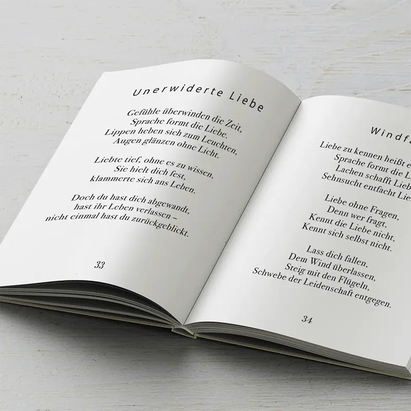 Also zögere nicht und lass uns loslegen! Mit unserer Leidenschaft für Qualität und Service bringen wir deine Gedichte in einer Form auf den Markt, die ihren Inhalt perfekt widerspiegelt.