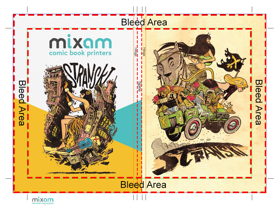- Front, Back, and Spine: These components require an additional 0.8" bleed on the top, bottom and outer edge. The bleed allows your cover artwork to extend around the cover boards.
