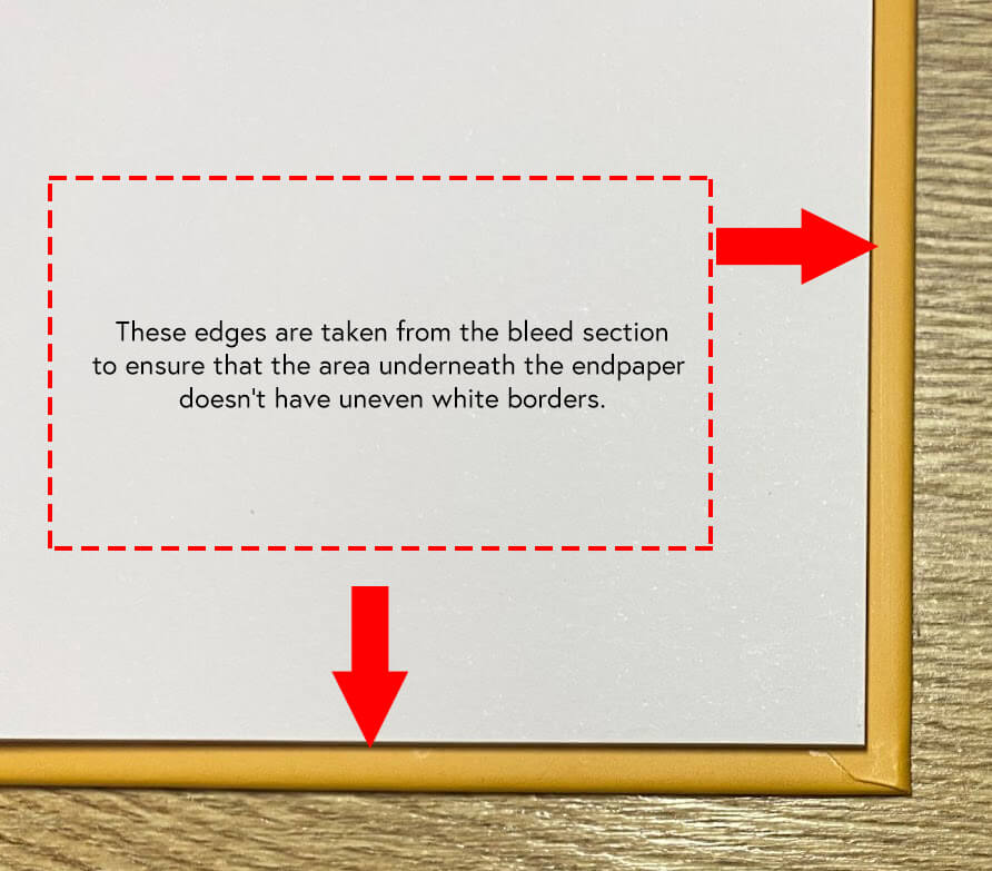 We print your cover artwork and wrap the additional 0.8" bleed around the backing board to form a printed case, some of which will be visible on the outer cover edges. The remaining bleed is tucked under the endpaper to create neat edges.