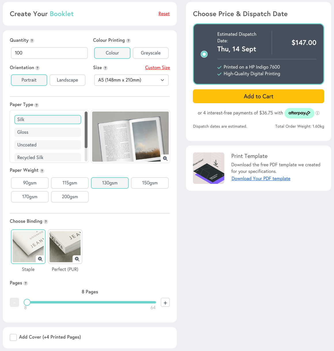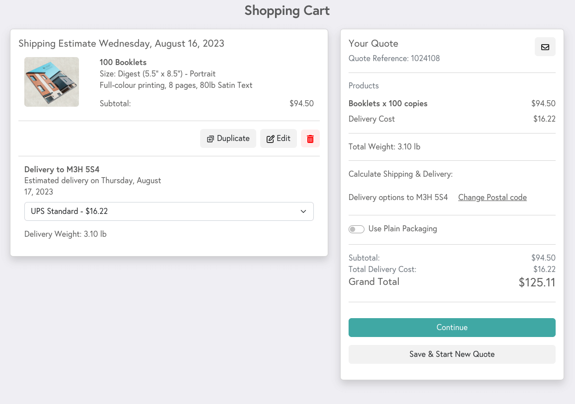 If you change your print specifications, our Instant Quote Calculator updates your quote automatically. You can choose Paper Weights, Binding options, and Finishes. You can also see available production options and estimated shipping dates. When satisfied with your quote and estimated shipping date, click the ‘Add to Cart’ button. An order summary will then appear so you can review the details.
