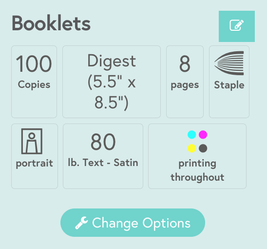 - Click the ‘Change Options’ button under your print specifications summary. The Instant Price Calculator will appear, and you can make adjustments. Your quote will automatically update on the right-hand side of your screen.