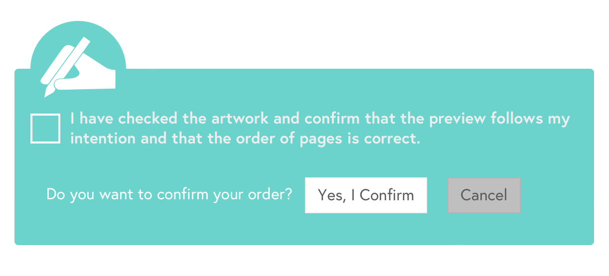 After filling in your Artwork, Details, and Payment tabs, the last step is to confirm your order at the top of the page. A print expert will check your confirmed order before sending it to production. We can only print your order once you confirm it, so please review your PDF Proof thoroughly before confirming.