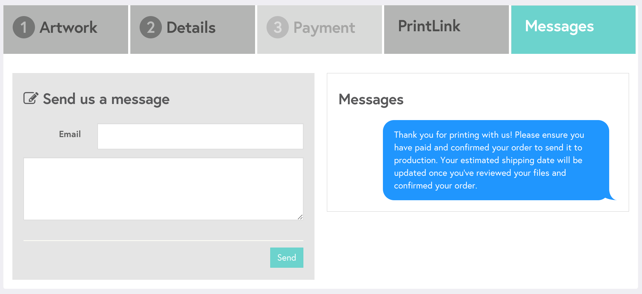 We are happy to answer any questions you have about your order in the Messages tab. If we need to contact you regarding artwork, production updates or inquiries, we’ll also contact you in the Messages tab. Every time we contact you, you’ll get an email, so please check your Spam/Junk folders for emails from us, as they can sometimes land there.