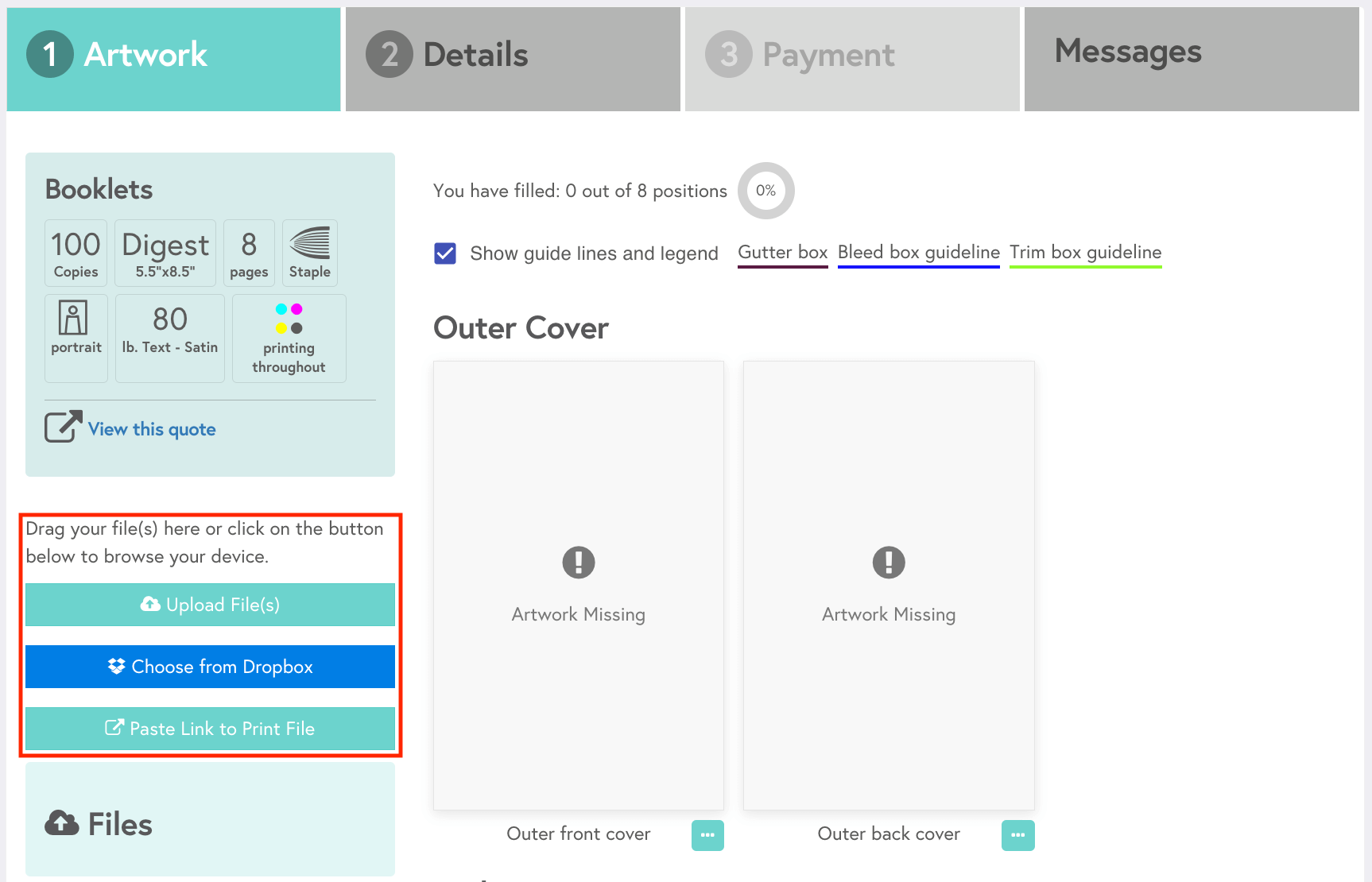 The Artwork Tab is the place to upload your design files, check proofs and make changes to your print specifications if necessary.
