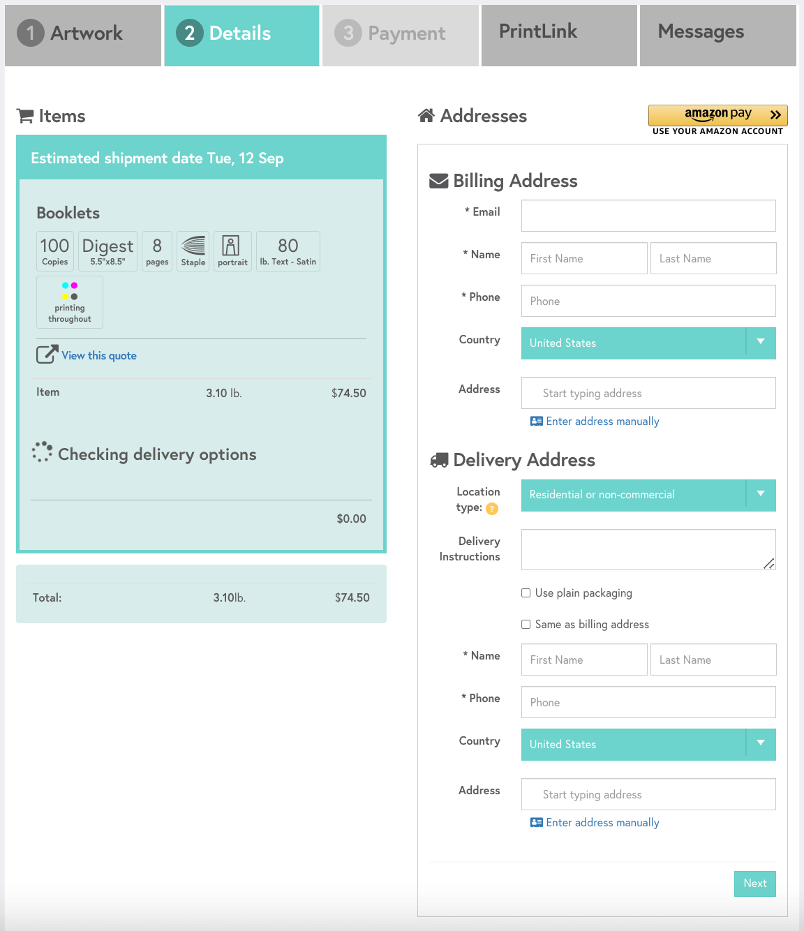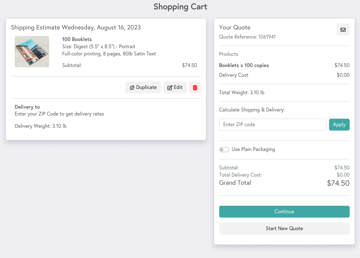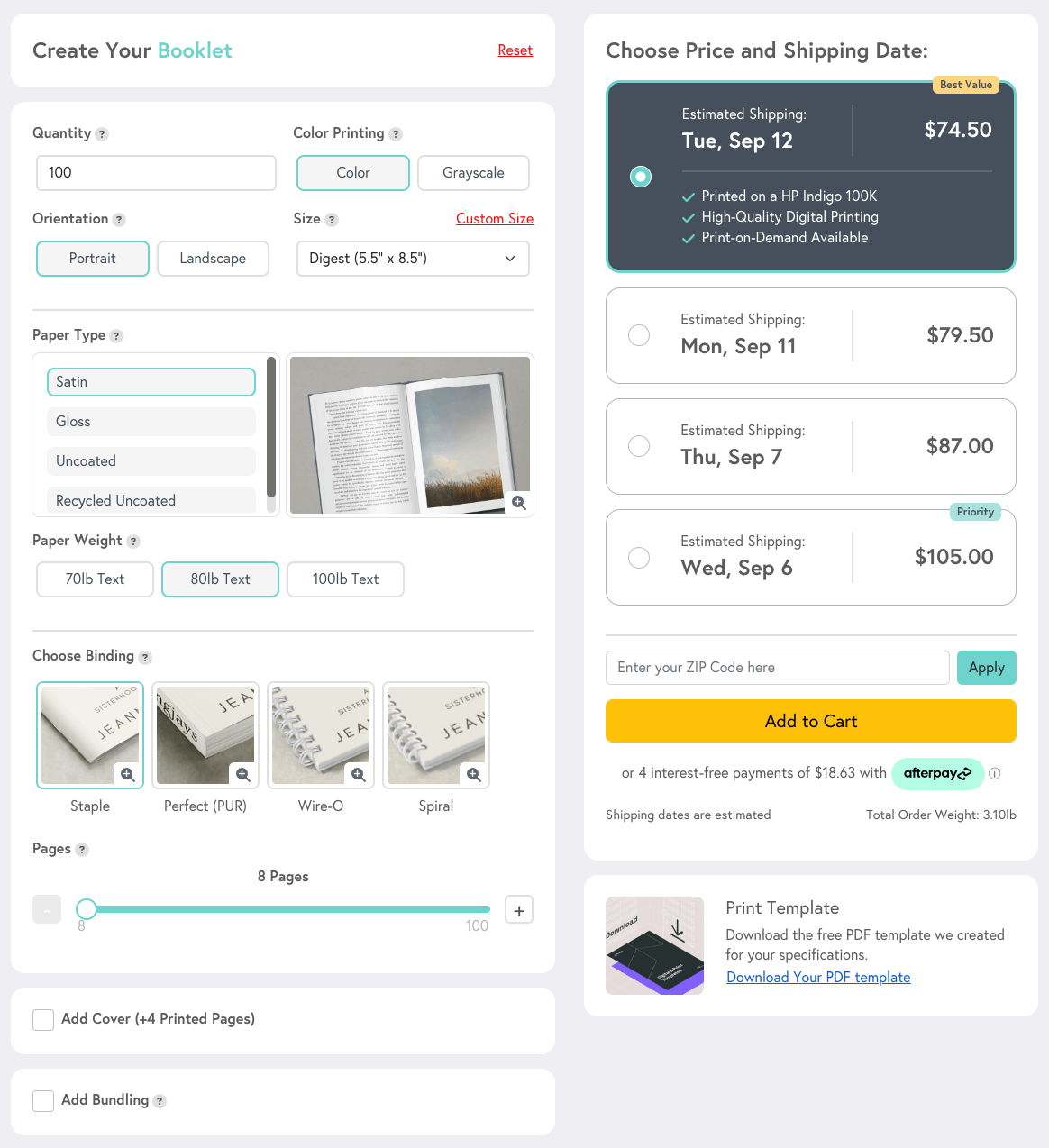 If you change your print specifications, our Instant Quote Calculator updates your quote automatically. You can choose Paper Weights, Binding options, and Finishes. You can also see available production options and estimated shipping dates. When satisfied with your quote and estimated shipping date, click the ‘Add to Cart’ button. An order summary will then appear so you can review the details.