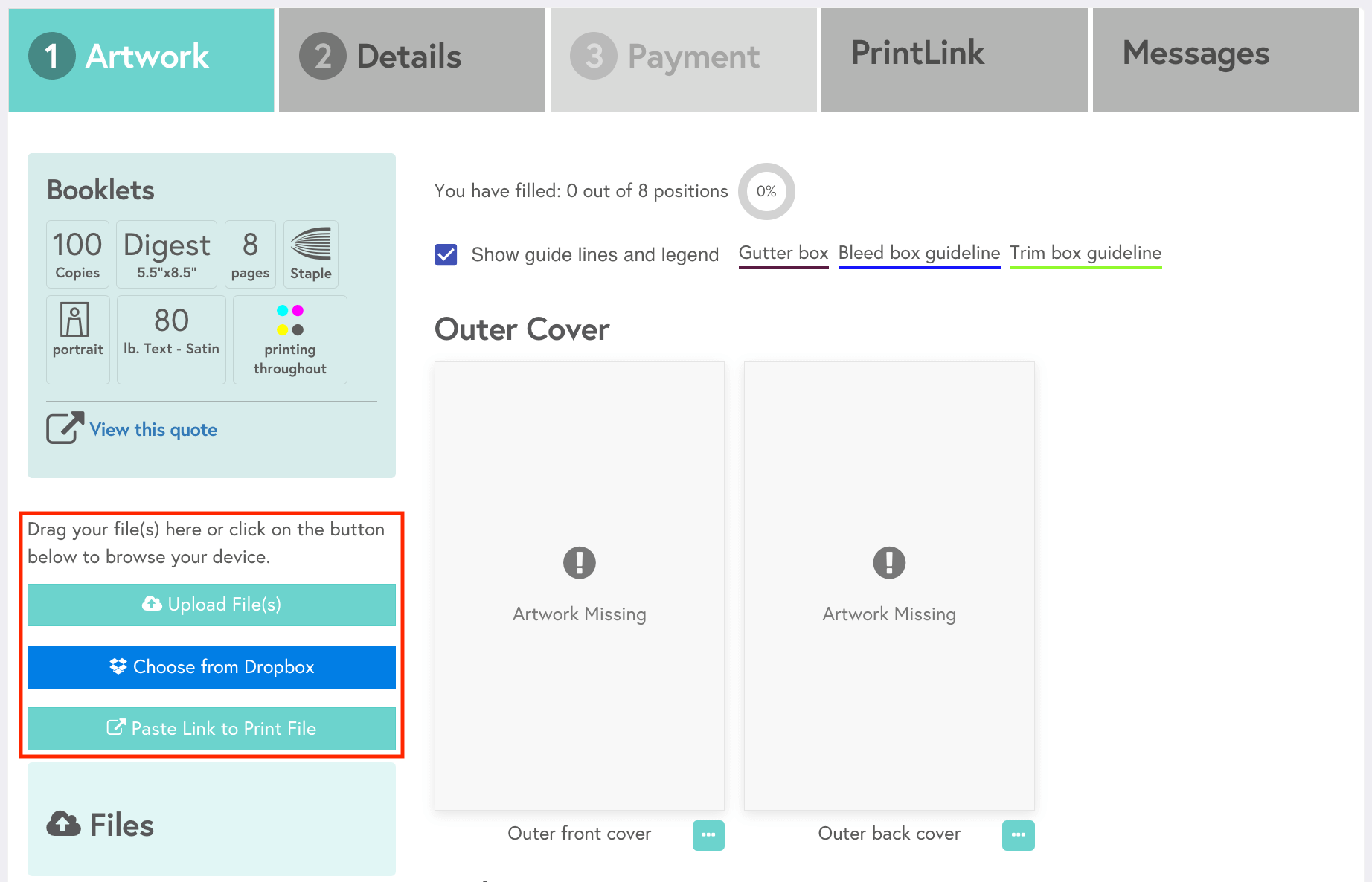 The Artwork Tab is the place to upload your design files, check proofs and make changes to your print specifications if necessary.