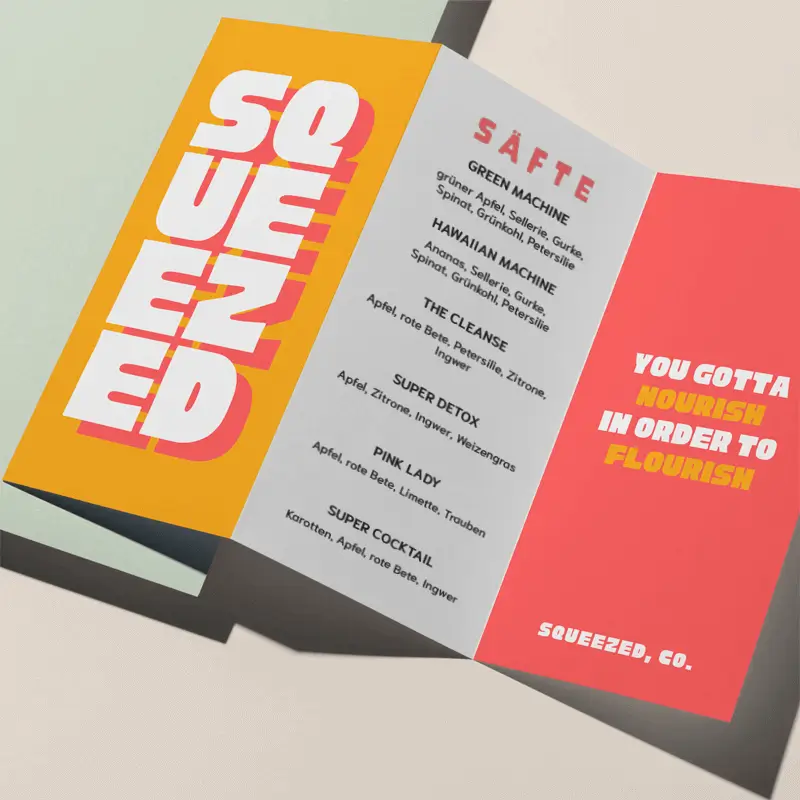 Für den perfekten Druck benötigen wir einen Beschnitt von 3 mm und einen Randabstand von 5 mm auf allen Seiten. Achte darauf, dass in diesem Bereich keine wichtigen Inhalte platziert werden. Wenn du ganzseitige Bilder verwendest, kannst du sie gerne bis zum Anschnitt ziehen.
