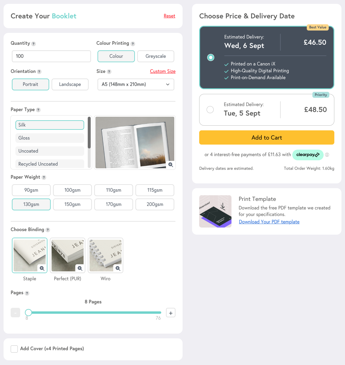 Our fast and sophisticated calculator adjusts prices and estimated delivery dates for free as soon as you amend your print specifications. It will even suggest alternative specifications and turnaround times, helping you save money every time.