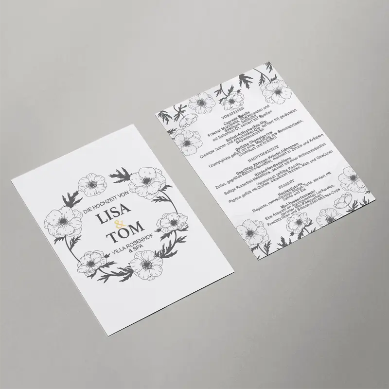 Mit Mixam kannst du deine Menüs individuell gestalten und hochwertig drucken lassen. Wähle aus robusten Papiersorten und besonderen Veredelungen, um deine Speisekarte perfekt auf dein Ambiente abzustimmen. Zeig deinen Gästen, was sie erwartet. Stilvoll, hochwertig und immer passend zu deinem Konzept.