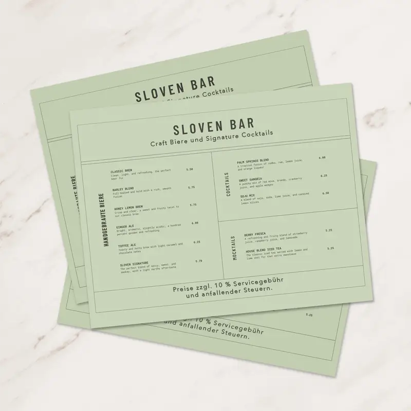 Der erste Eindruck zählt – besonders bei deinen Gästen. Deine Speisekarte ist mehr als nur eine Liste von Gerichten, sie ist deine Visitenkarte, die den Stil und die Atmosphäre deines Lokals widerspiegelt. Ob für gehobene Restaurants oder gemütliche Cafés, eine ansprechend gestaltete Karte lädt zum Verweilen ein und macht Appetit auf mehr.