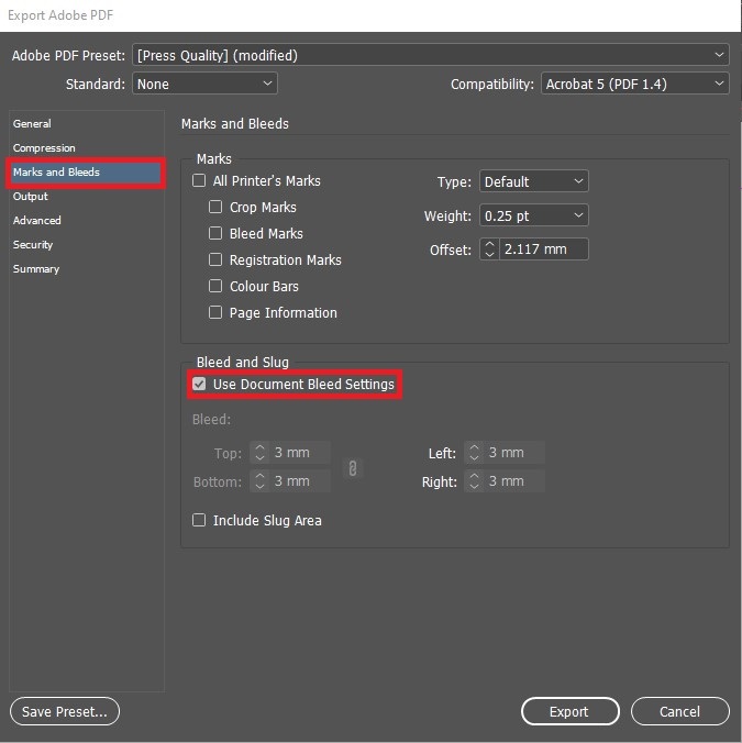 TIP: If you use a program like InDesign, select Use Document Bleeds in the Export PDF dialogue box to ensure your files include a bleed (see above).
