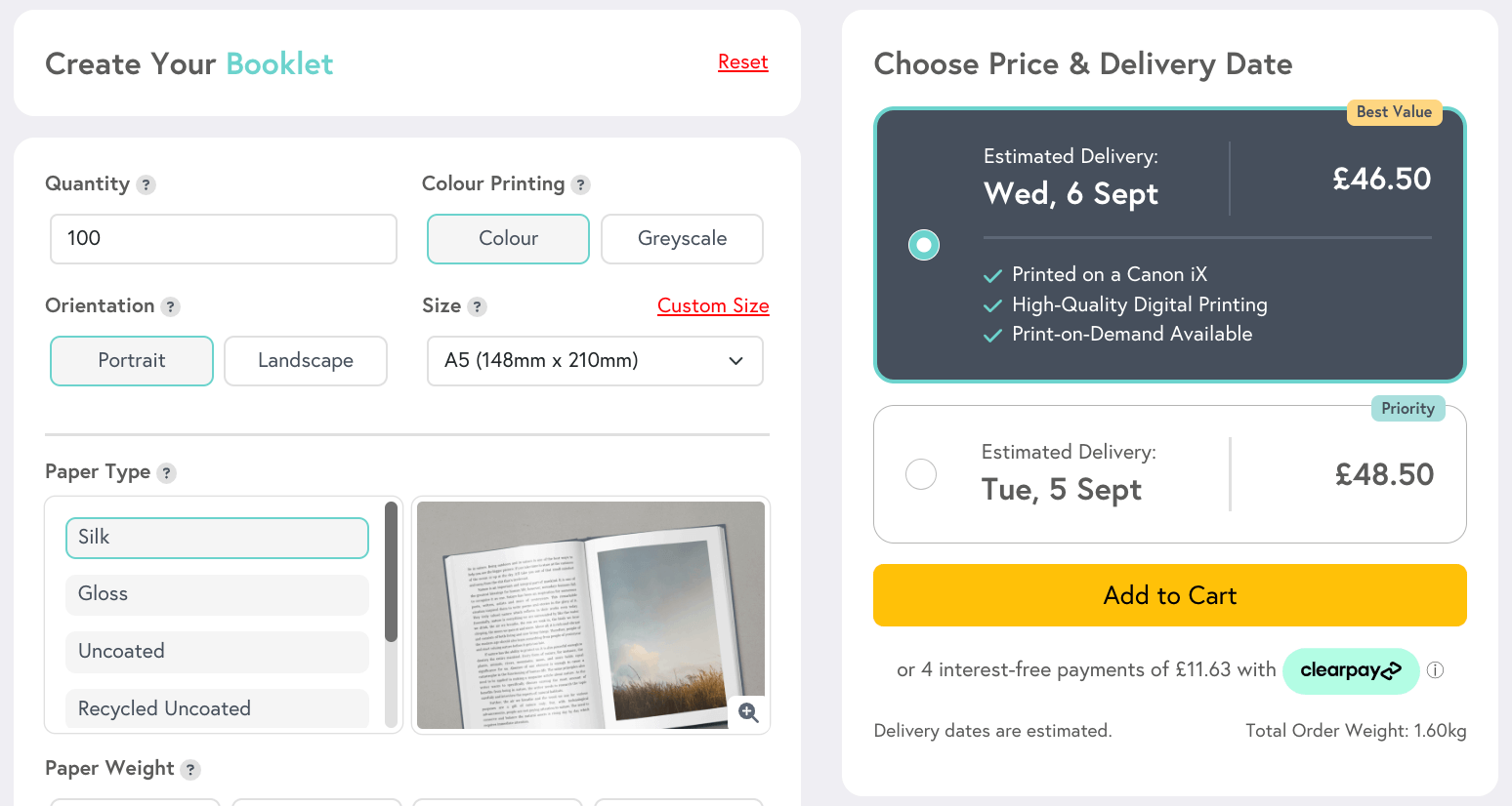Digital presses will print small runs with a short turnaround time, whereas litho presses are better suited to large runs and incur longer turnaround times. But you can rely on our Instant Price Calculator to work out the best options for you.